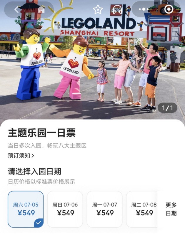 值得注意的是,由于上海乐高乐园开园日期为暑假期间,属于旺季时段,首日549元的价格为高峰日价格。